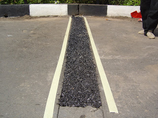 Setelah sambungan yang dibongkar dalam kondisi siap, maka pada bagian celah dalam 30 mm dari bagian dasar dimasukkan tali tambang. Lapisi seluruh sisi yang dibongkar dengan menggunakn aspal bitumen yang berfungsi sebagai pengikat antara bagian aspal lama dengan aspal baru. Pasangkan baja dalam kondisi datar tidak ada beda tinggi antara sisi-sisinya ini dimaksudkan agar pada saat menerima beban dari atas plat baja tidak bergerak yang menyebabkan siar muai retak.